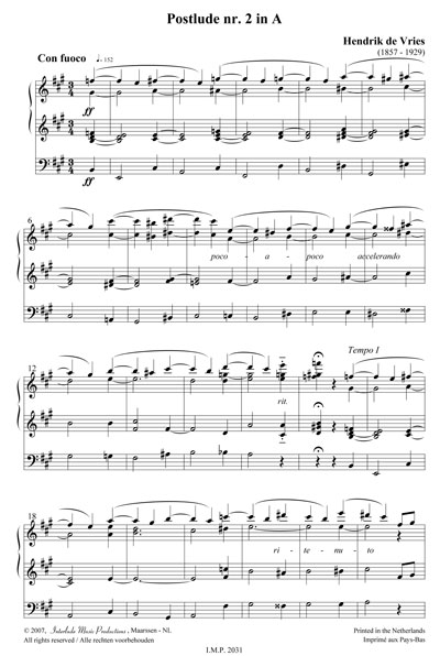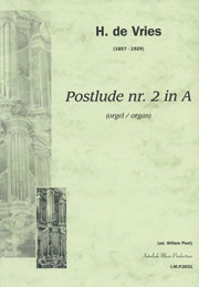 Hendrik de Vries was born in Amsterdam in 1857. His learned to play the organ from his father, Simon Reinier de Vries. During his lifetime Hendrik de Vries was considered one of the greatest organists in the Netherlands. From 1873 he was subsequently organist in Breukelen, Broek in Waterland and the English Church in Amsterdam (Begijnhof). In 1886 he received the position of organist of the Stevenskerk in Nijmegen, succeeding Donald Hugo Dijkhuijzen. From 1897 till his death in 1929 he was organist of the Laurenskerk in Rotterdam. This Postlude dates from 1905 and is written in symphonic style.